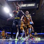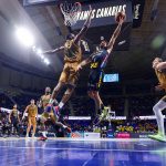 Un par de triples abiertos de Burjanadze fueron el primer aviso serio de los visitantes (10-10), que luego irían ganando en confianza, explotando entre otras cosas la inspiración desde el perímetro de Bertans (4/4 en triples en la primera mitad). El Canarias no terminaba de jugar del todo cómodo, pero dominaba la batalla del rebote y las segundas opciones le mantenían en la pomada (23-26, min. 10).