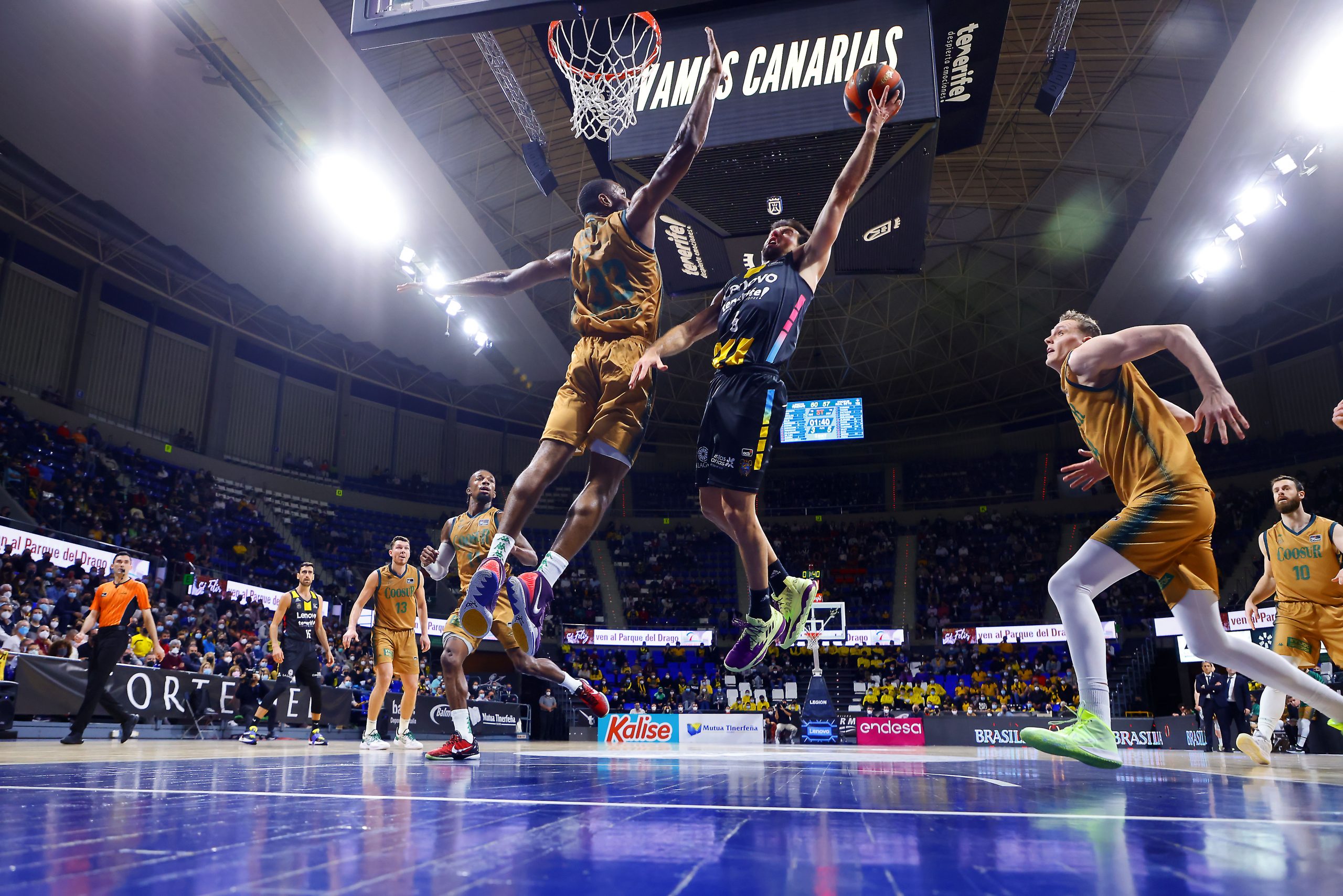 Un par de triples abiertos de Burjanadze fueron el primer aviso serio de los visitantes (10-10), que luego irían ganando en confianza, explotando entre otras cosas la inspiración desde el perímetro de Bertans (4/4 en triples en la primera mitad). El Canarias no terminaba de jugar del todo cómodo, pero dominaba la batalla del rebote y las segundas opciones le mantenían en la pomada (23-26, min. 10).