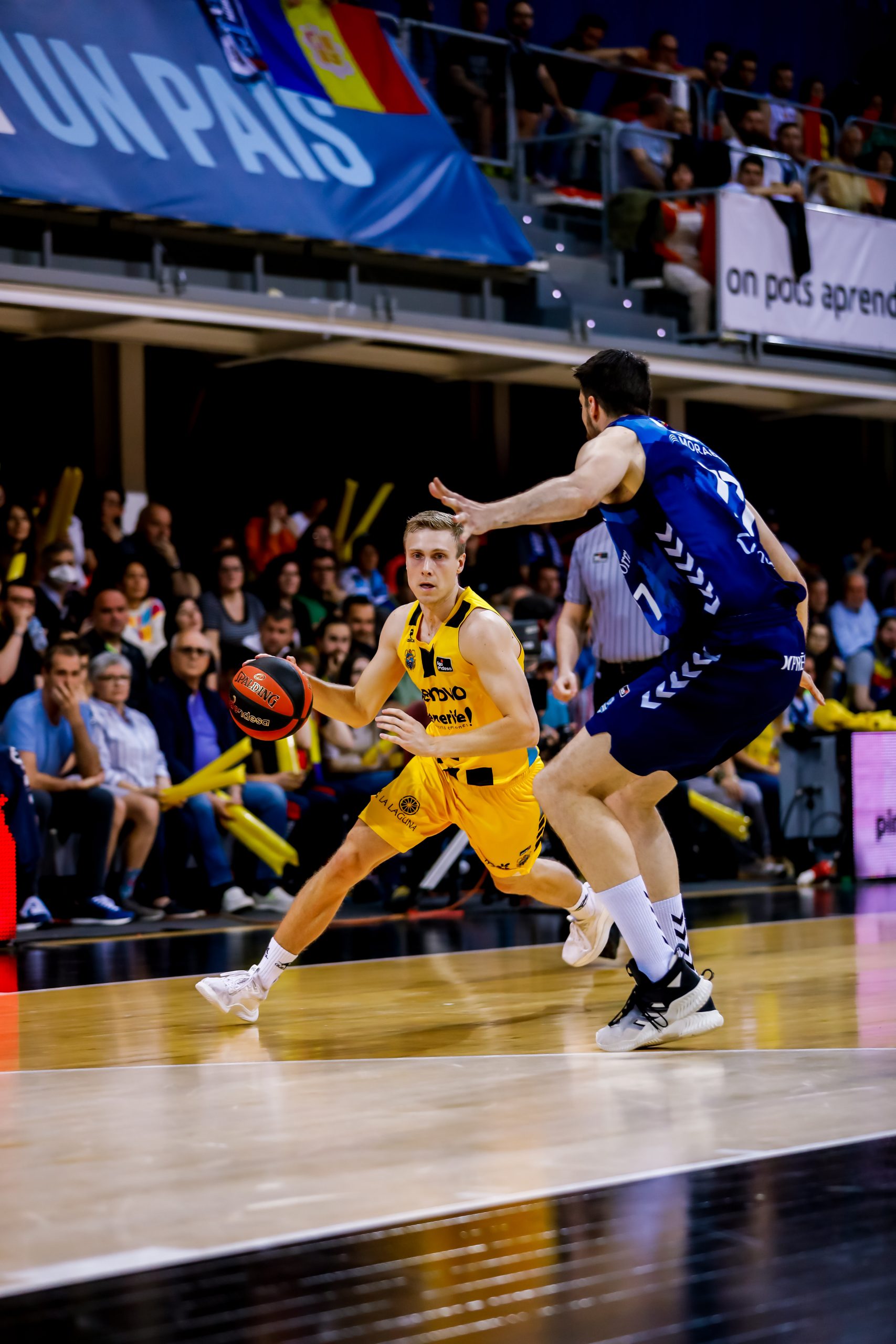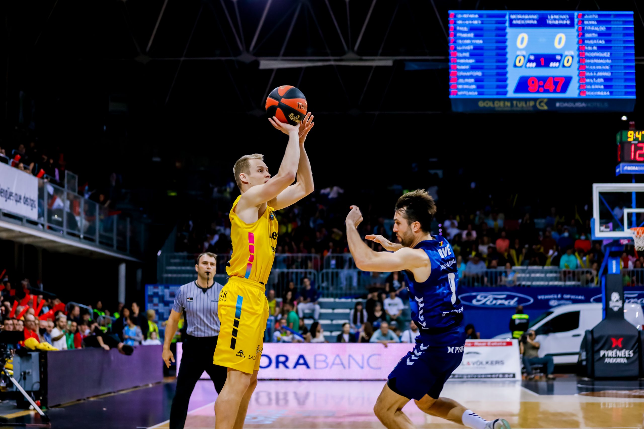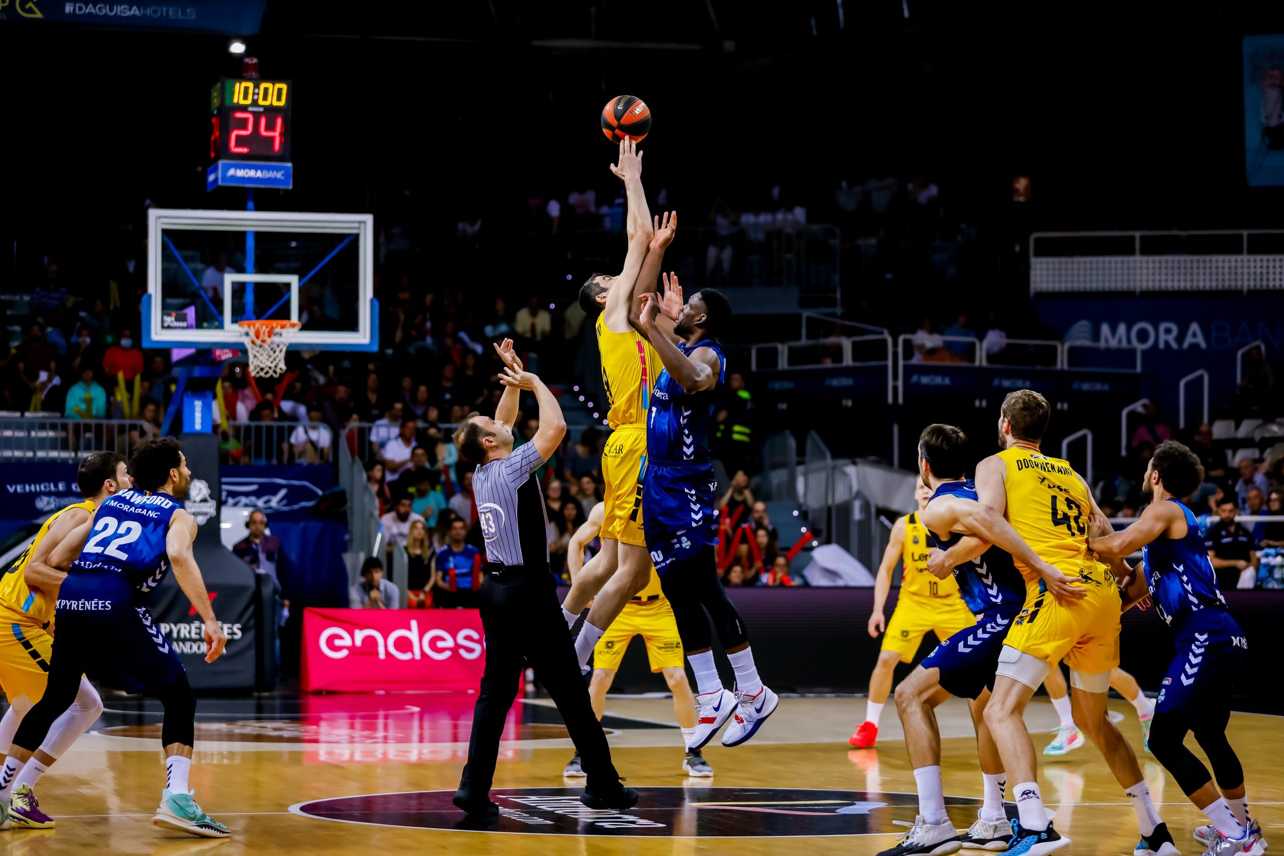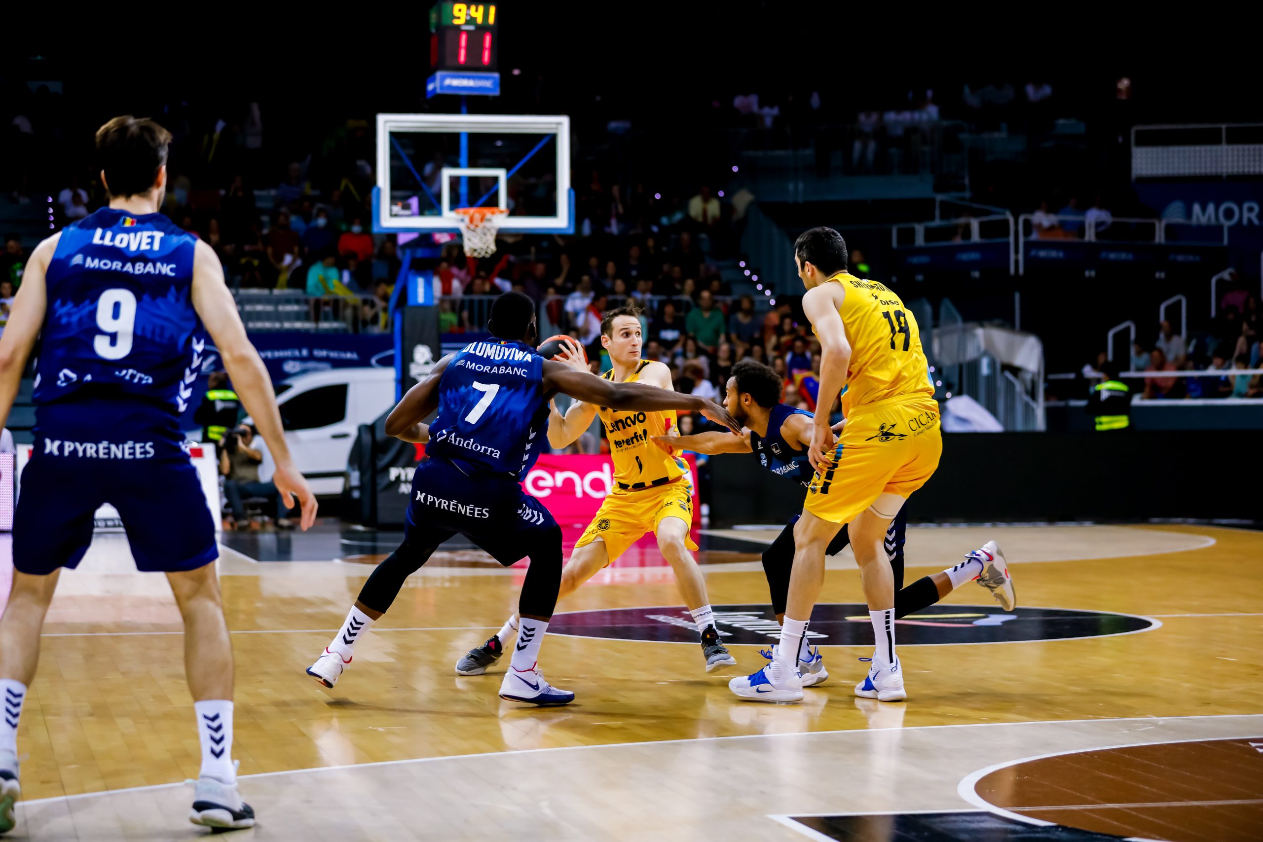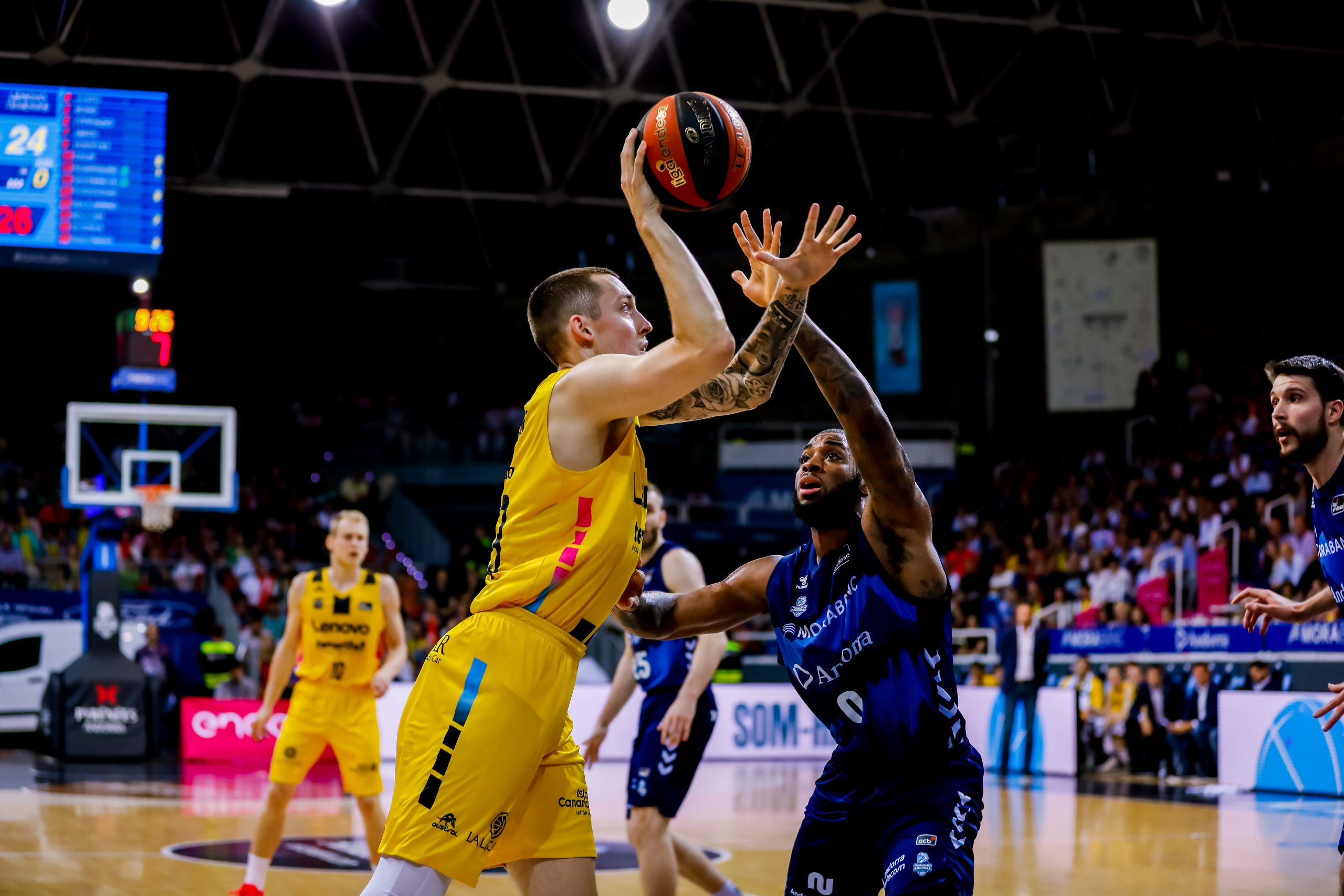 Hasta un 5/7 en cuatro minutos disparaba ya de inicio a los insulares (9-15); mientras que el Morabanc intentaba compensar la balanza con las acciones interiores de Babatunde y los aciertos también lejanos de Crawford. El partido nació y creció a un ritmo considerable, pero el buen balance defensivo de los laguneros impedía al Andorra sentirse cómodo.