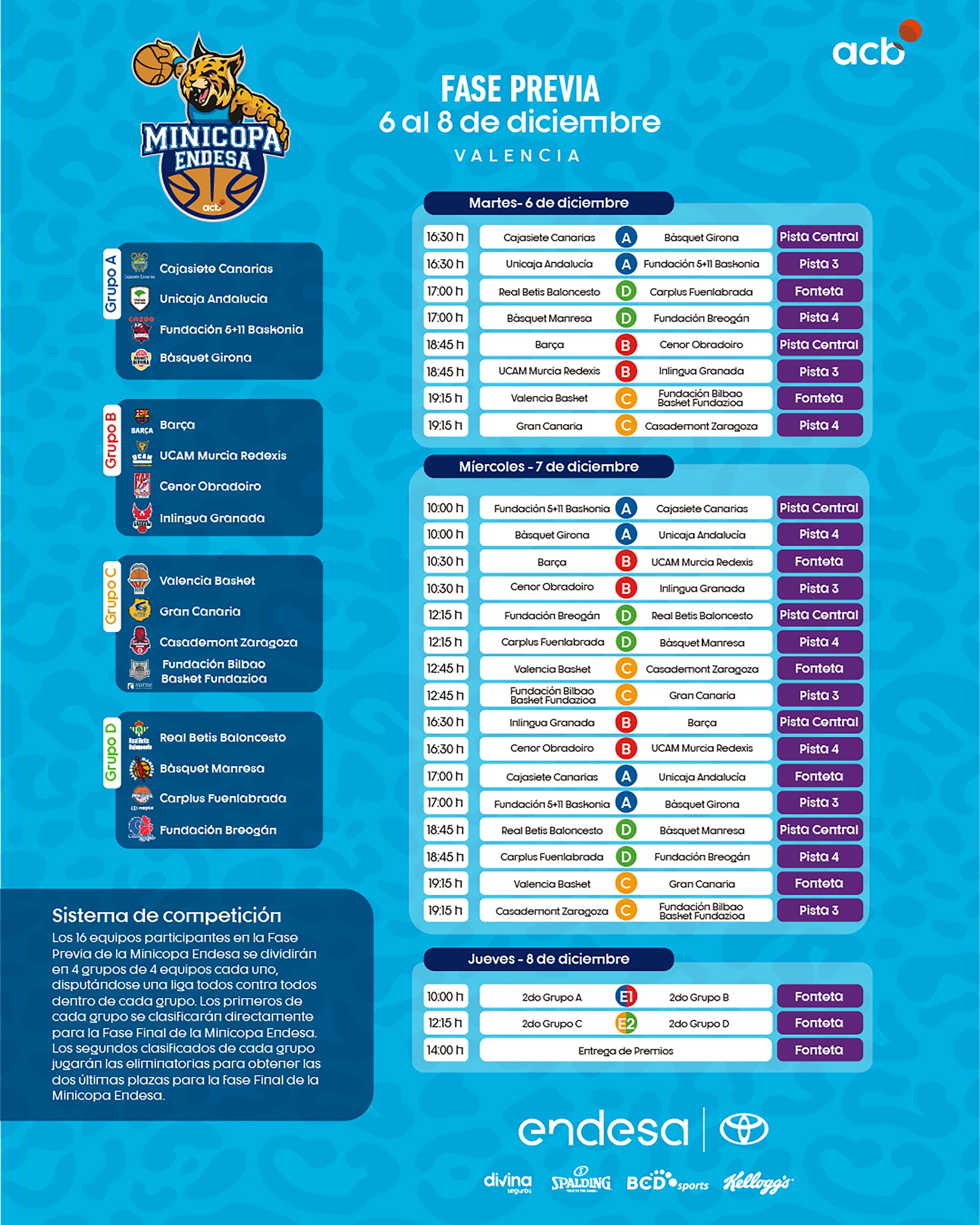 El filial aurinegro, dirigido por Eduardo Sanjuán, hará su debut en la fase previa, este martes, ante el Básquet Girona, a las 15:30 hora canaria; para luego medirse el miércoles día 7 al Fundación 5+11 Baskonia, a las 9:00 hora insular; y al Unicaja Málaga, ese mismo día, a las 16:00 hora canaria, partido este último a jugarse en La Fonteta. Todos los encuentros podrán seguirse online a través del canal oficial youtube de la ACB.