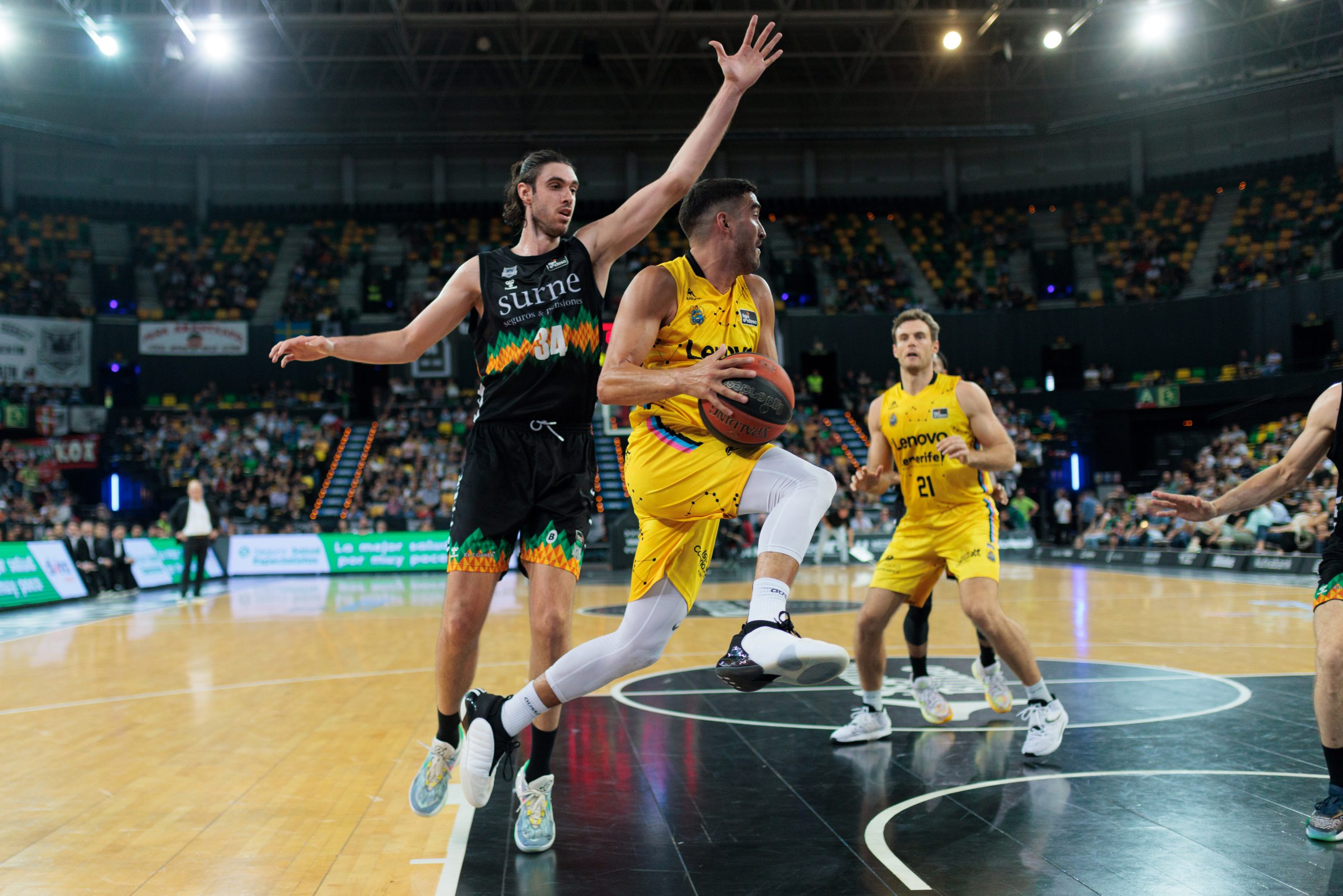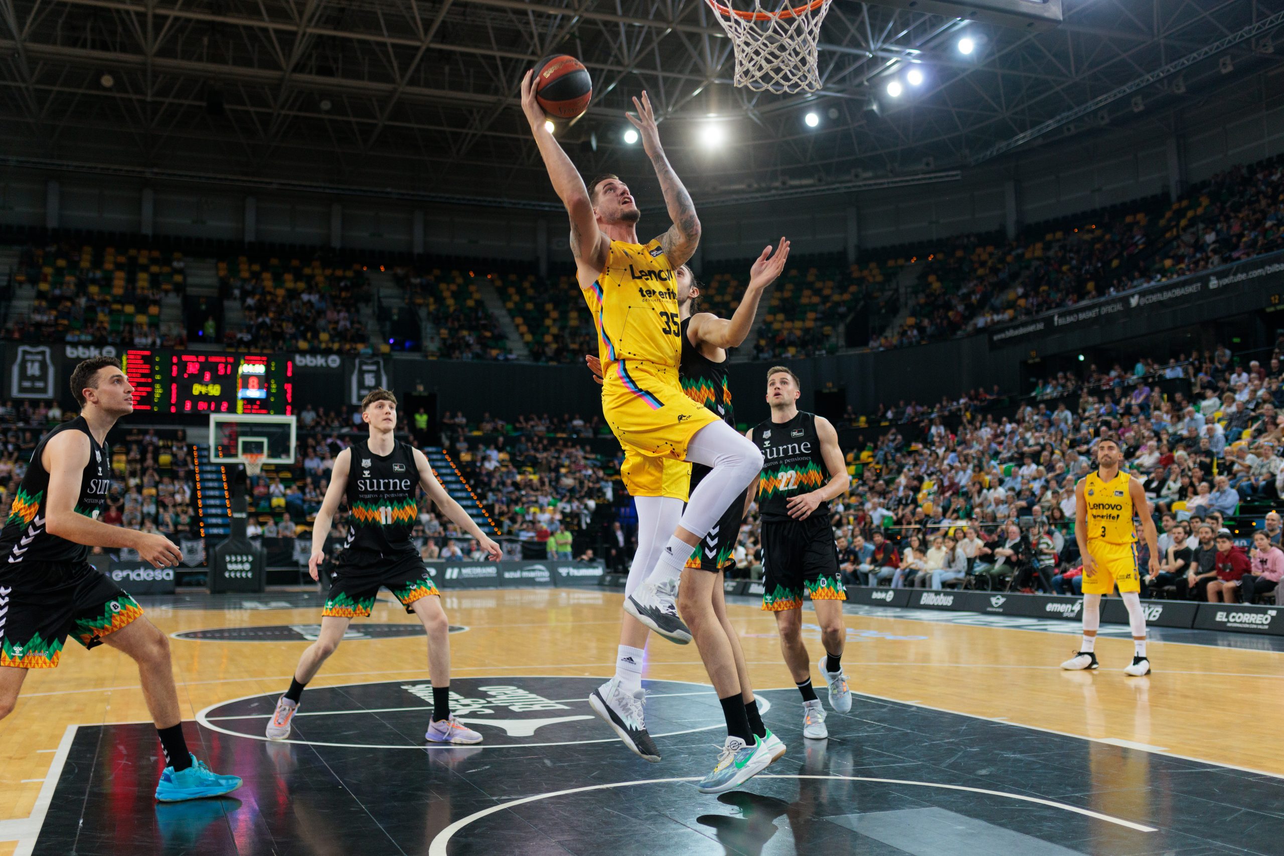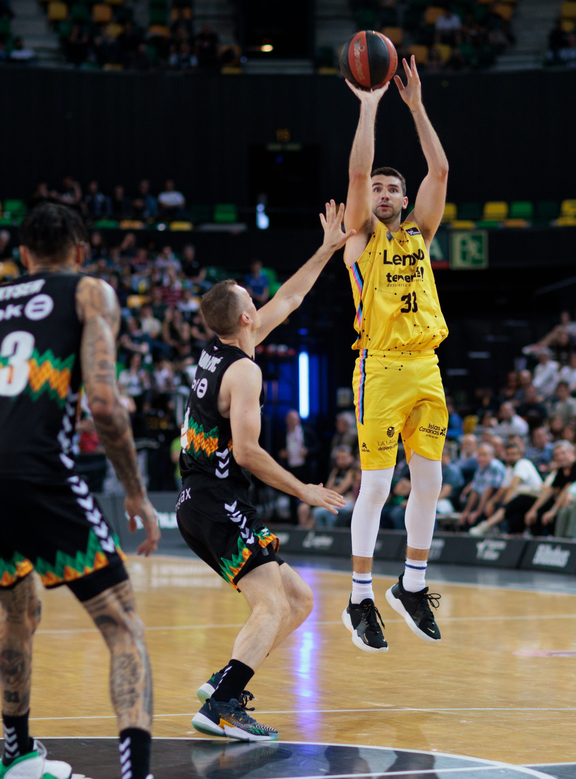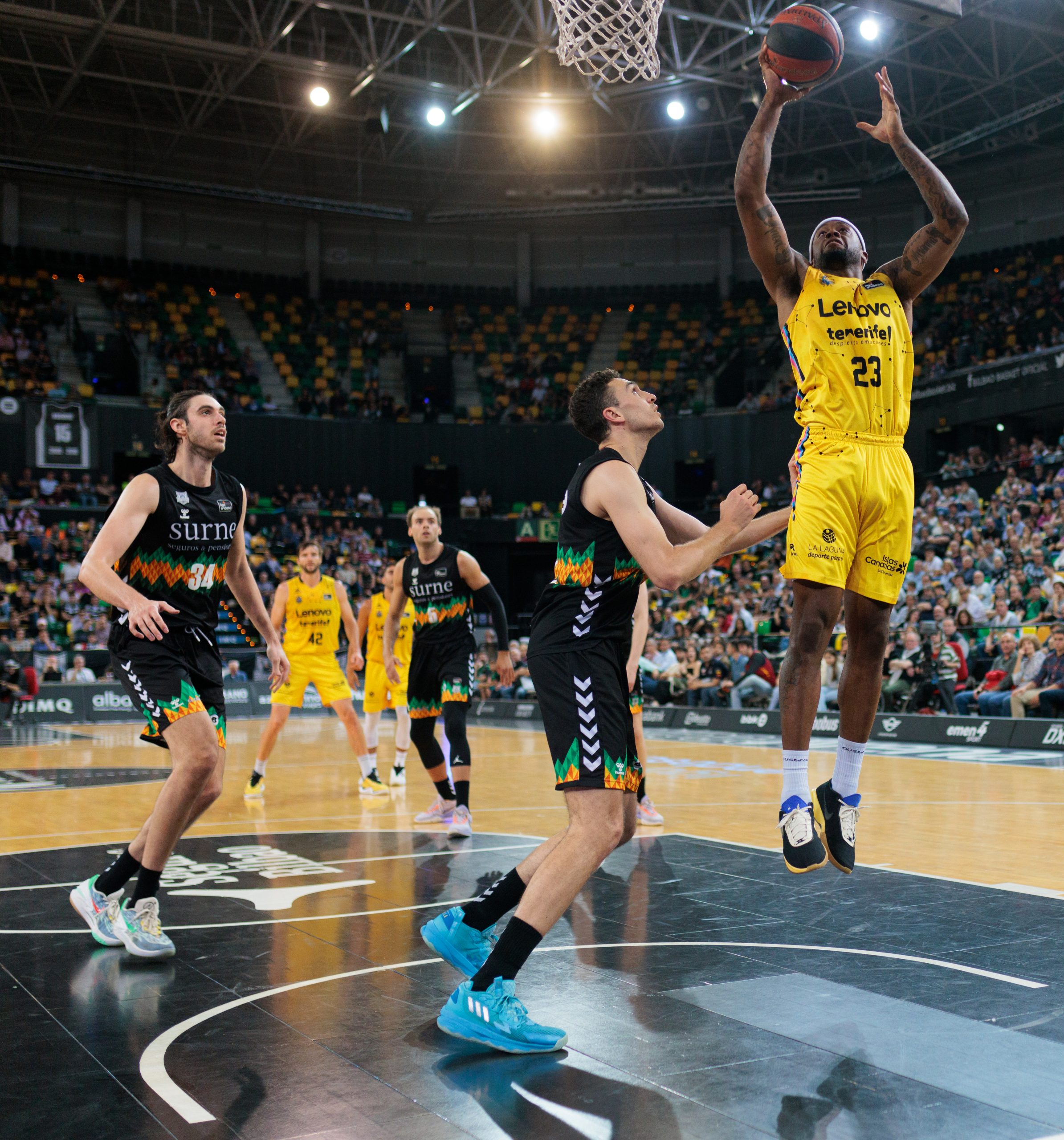 Arrancó muy metido el equipo aurinegro, que movió el balón con fluidez y criterio para ir desarbolando progresivamente a un Surne Bilba Basket incapaz de contrarrestar la puesta en escena canarista. Sin alardes en el triple, los tinerfeños sí que se mostraron casi infalibles en el tiro de dos (9/11 en el primer cuarto), gozaron incluso de varias segundas acciones y se fueron hasta los 20 puntos de ventaja al poco de iniciarse el segundo cuarto (10-30).