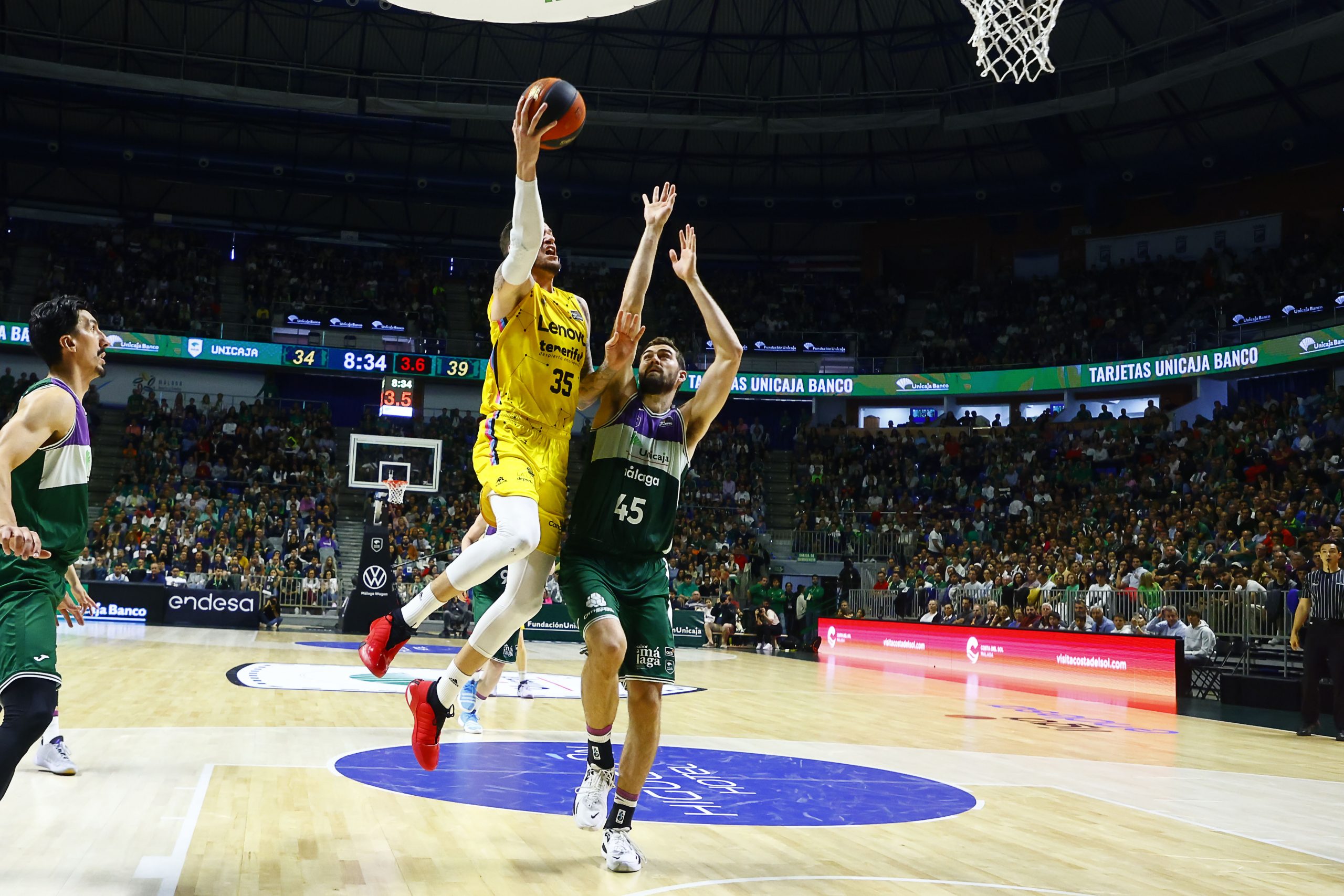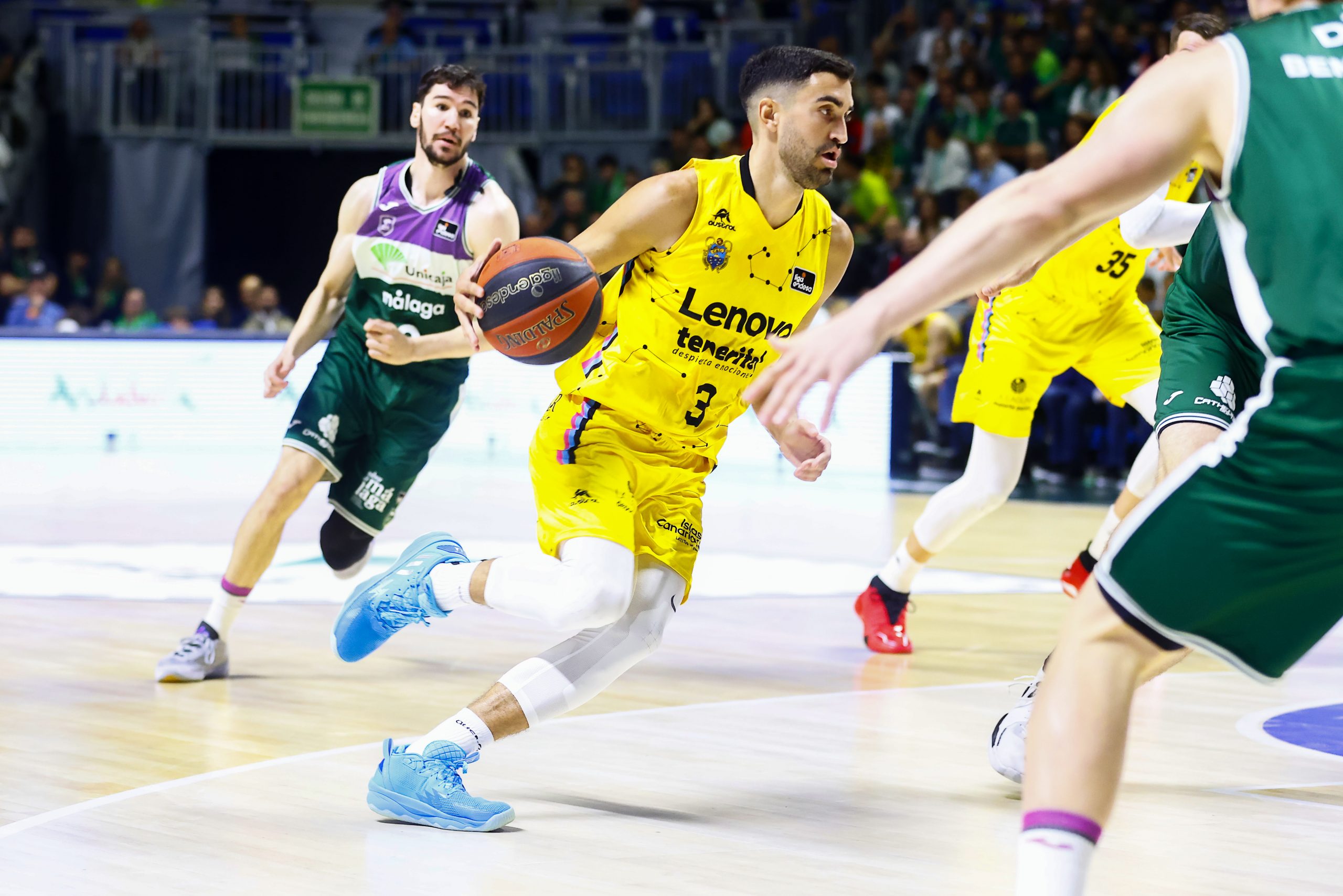 No fue buena la puesta en escena del Lenovo Tenerife, que tuvo problemas para circular el balón con la fluidez deseada, ante el buen hacer de los anfitriones apretando mucho las líneas de pase y castigando luego las pérdidas tinerfeñas. Con la defensa local bien cerrada sobre Gio Shermadini, que recibió numerosos contactos en el juego sin balón, el Unicaja amagó con abrir brecha pronto en el electrónico: 7-2, 10-4 y 19-11, tras sendos triples de Brizuela y Carter.
