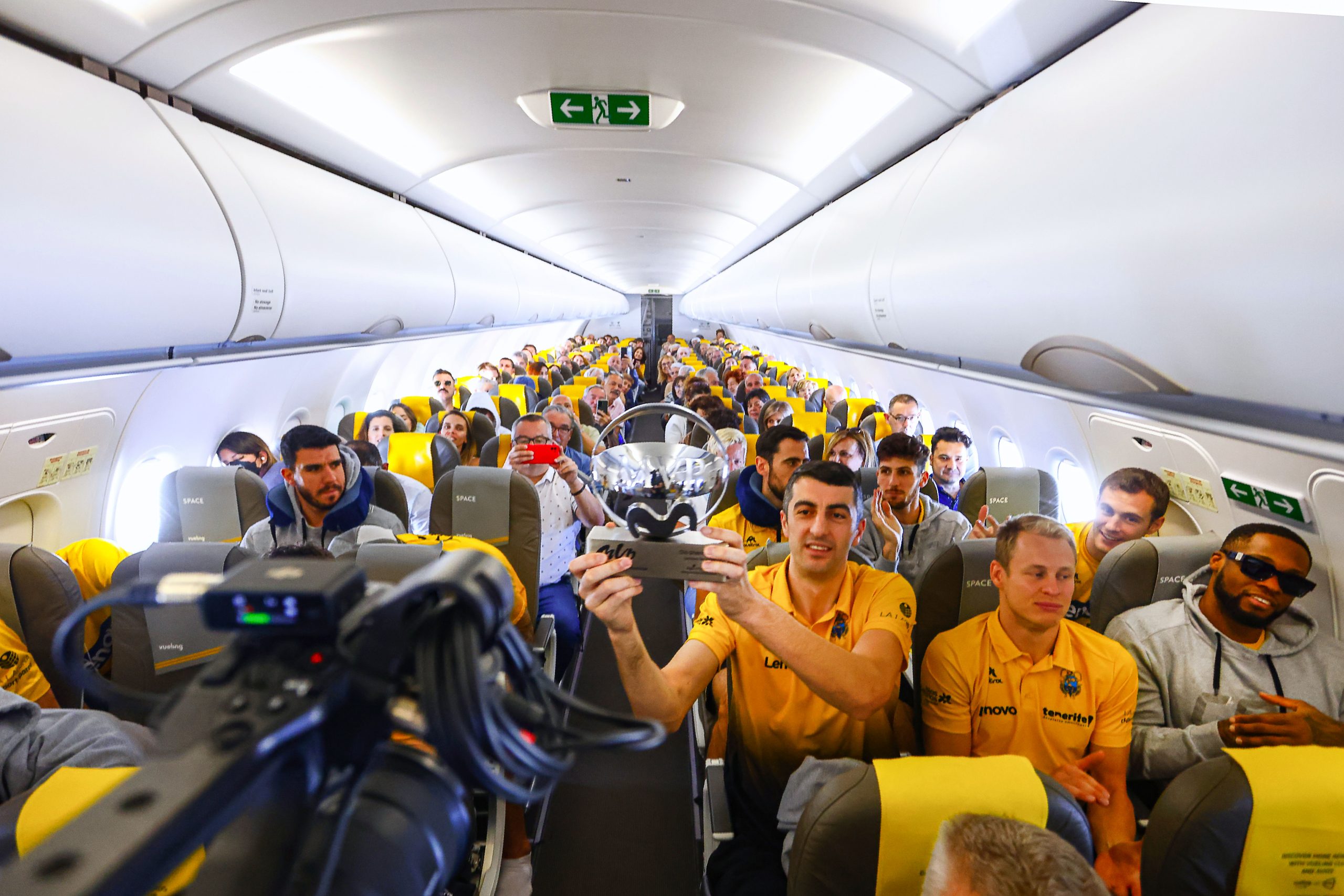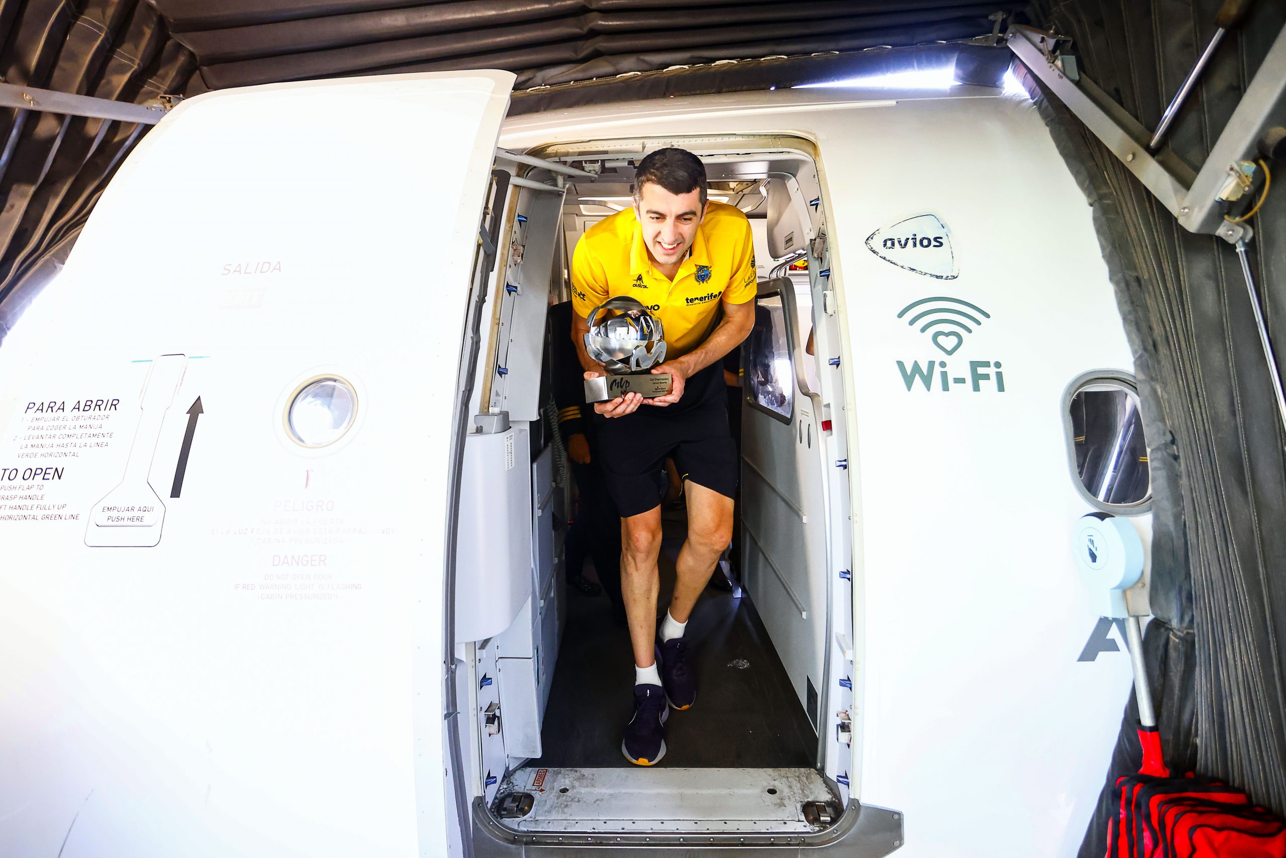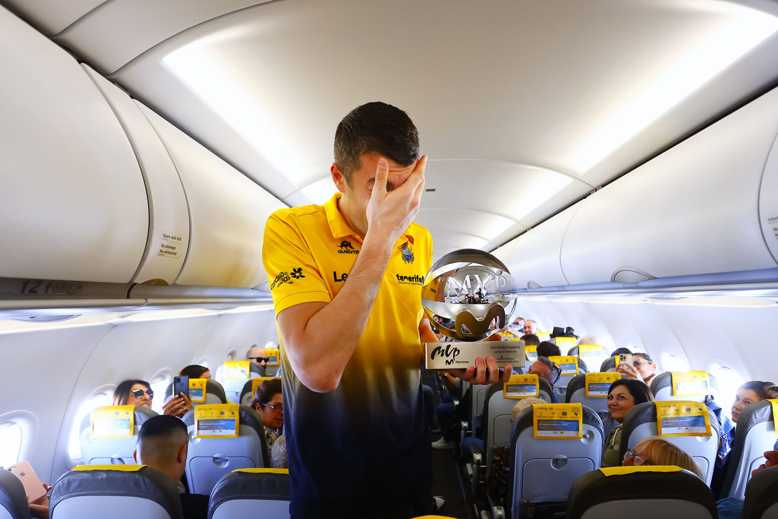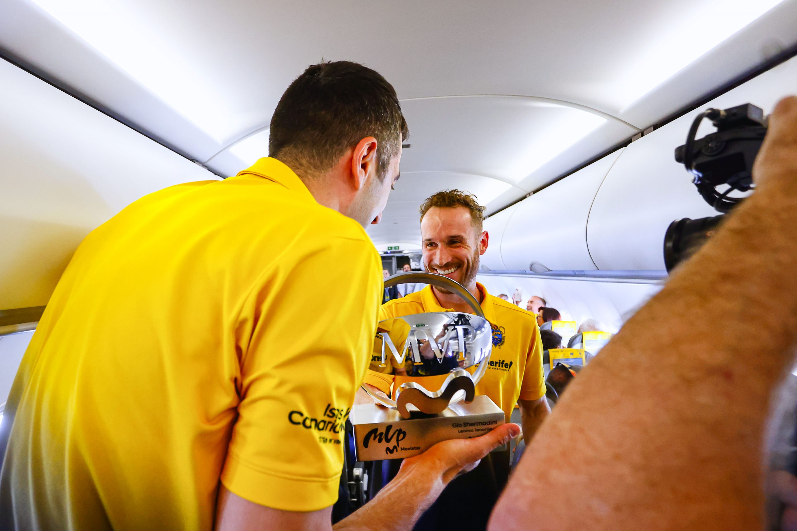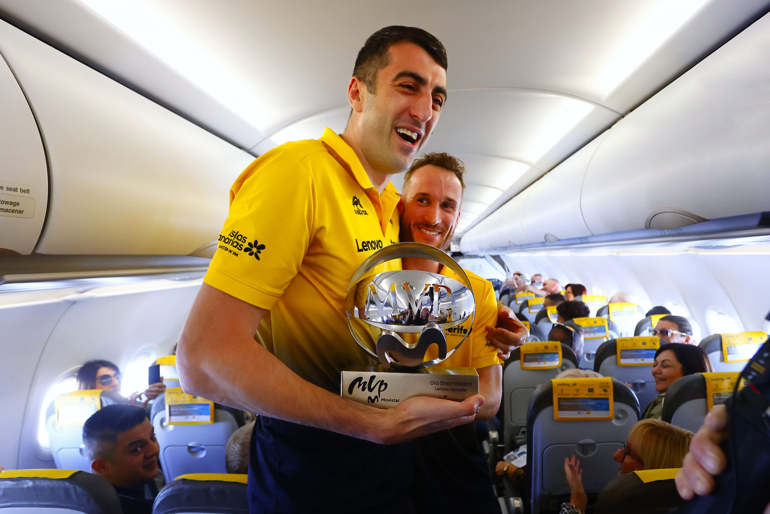 viernes, 26 mayo, 2023 - 11:05El pívot del Lenovo Tenerife, Gio Shermadini, es el MVP Movistar de la Liga Endesa 22/23. El canarista, elegido por afición, jugadores, entrenadores y prensa, recibió el trofeo por sorpresa a 11.000 metros de altura, rodeado por sus compañeros.