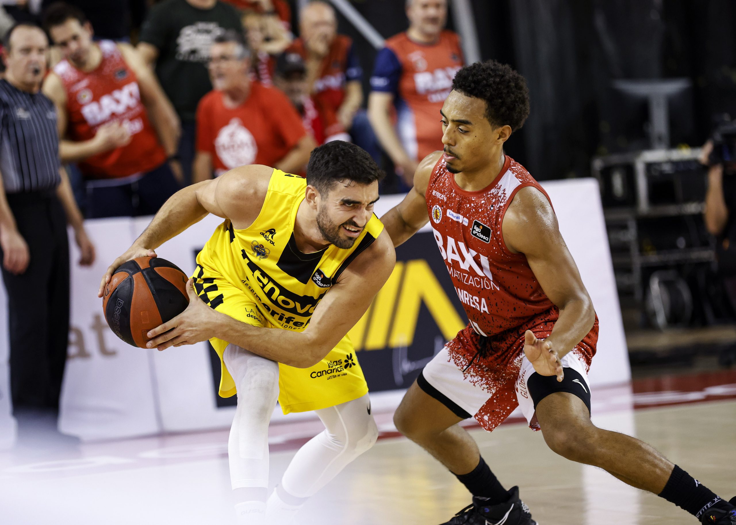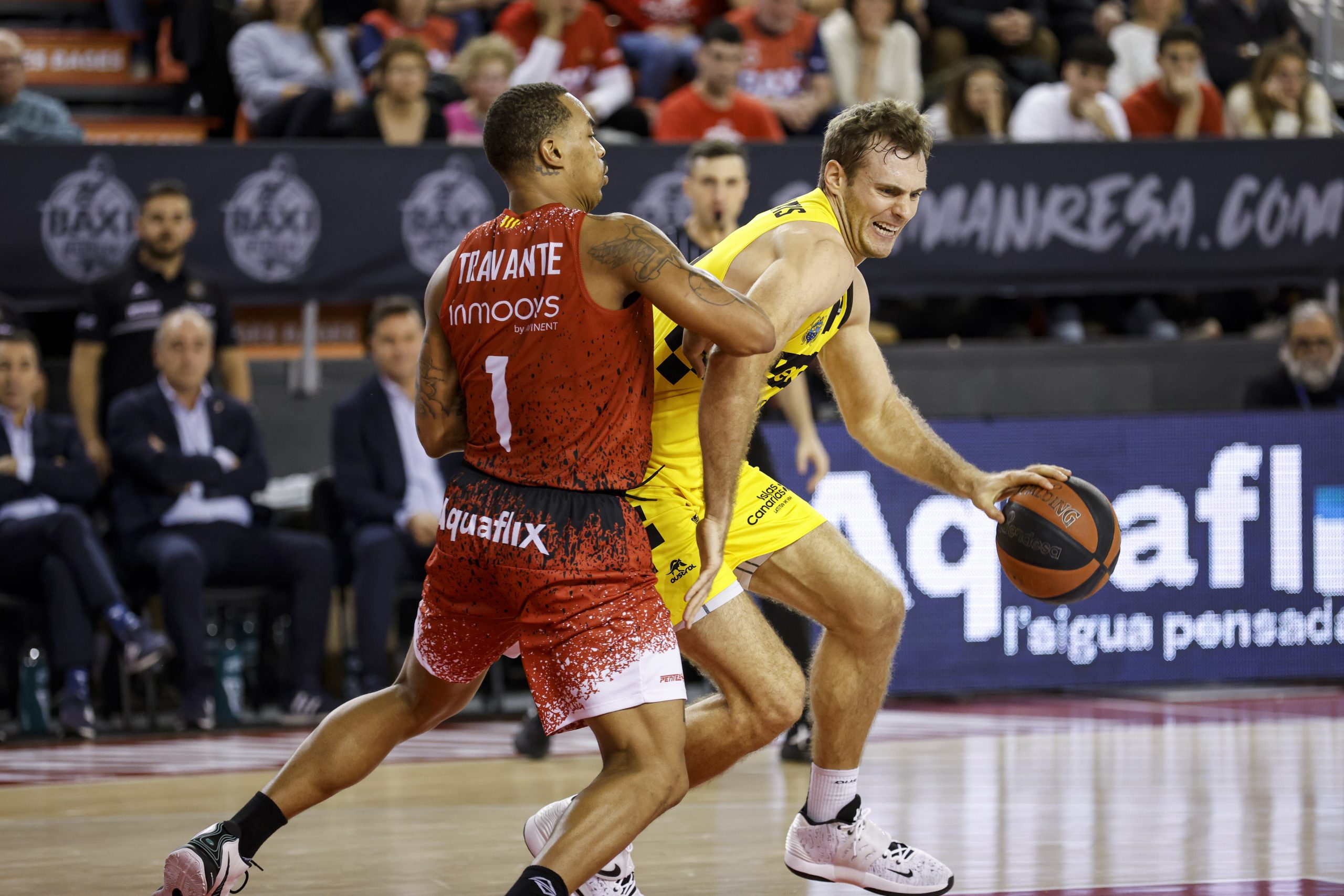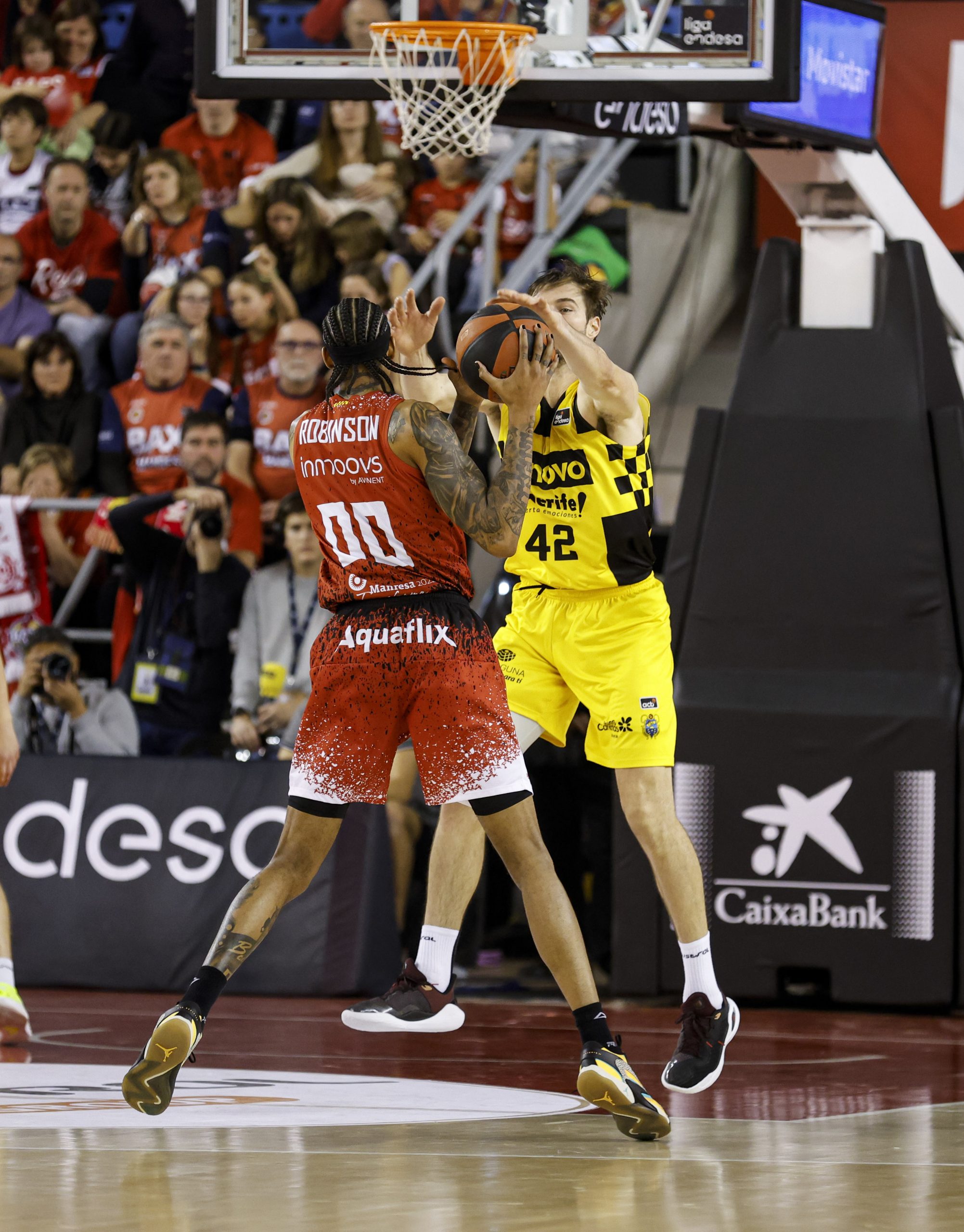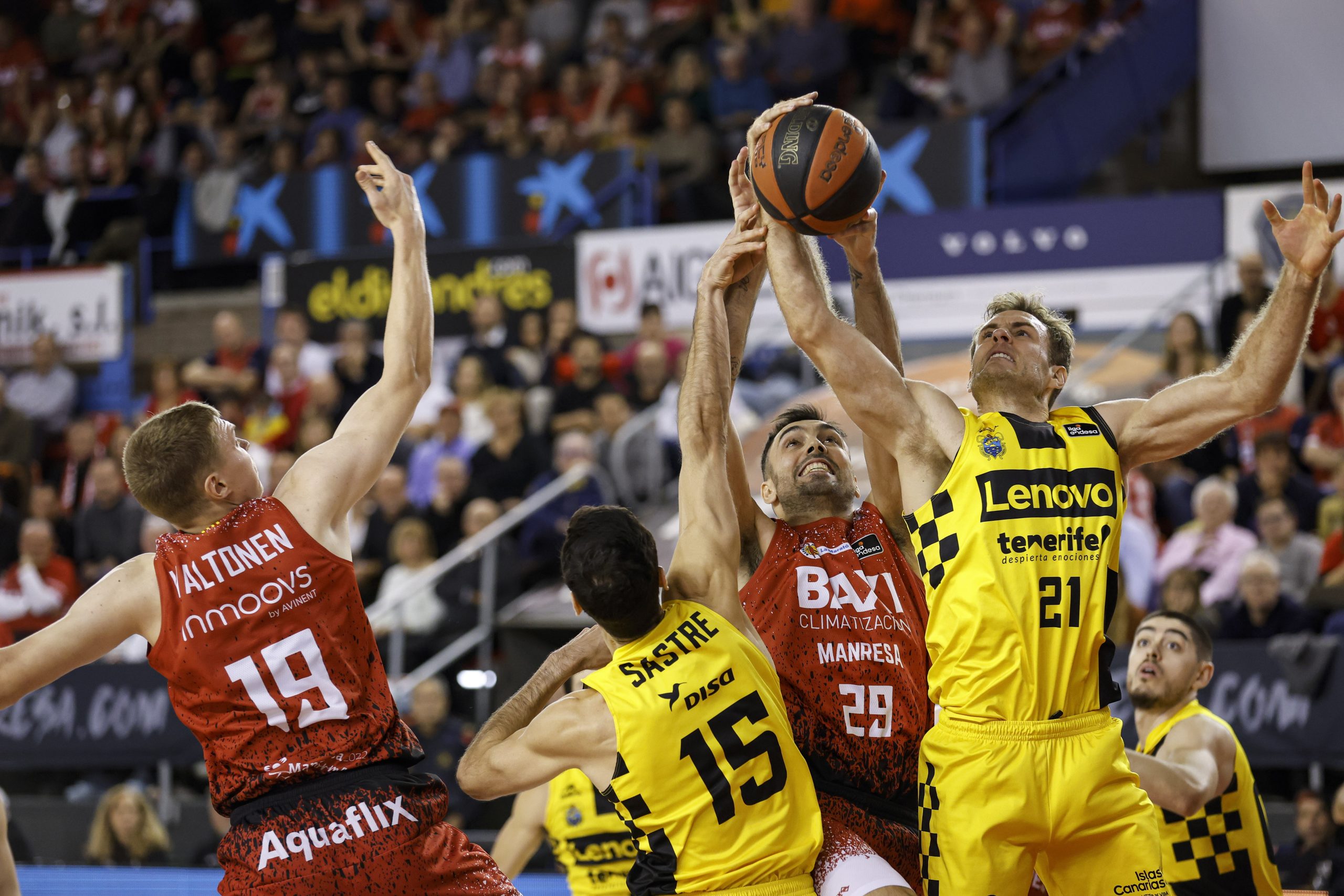 Errático desde el 6,75 (3/16 al descanso), el BAXI Manresa se agarraba al partido desde el rebote ofensivo (hasta diez al receso), pero el Canarias, sin un cinco puro de entrada para contrarrestar la propuesta rojilla, se mantenía firme y amagaba con estirar su ventaja: 19-26, tras triple de Joan Sastre. Un 8-0 tras tiempo muerto revolucionaba por momentos el encuentro para los locales (27-26), aunque el Lenovo Tenerife respondía con entereza.