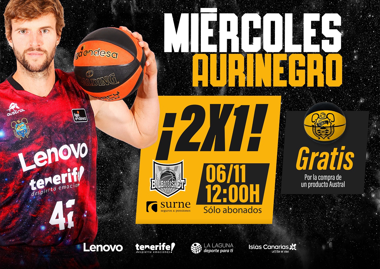 El Lenovo Tenerife retoma los “Miércoles Aurinegros”. El club canarista lanzará este miércoles día 2 de noviembre una promoción especial para abonados de 2×1 en entradas, sólo válida ese día, de cara al atractivo choque liguero del próximo domingo, ante el Surne Bilbao Basket (Santiago Martín, 12:00 horas). Los abonados interesados en acogerse a la […]